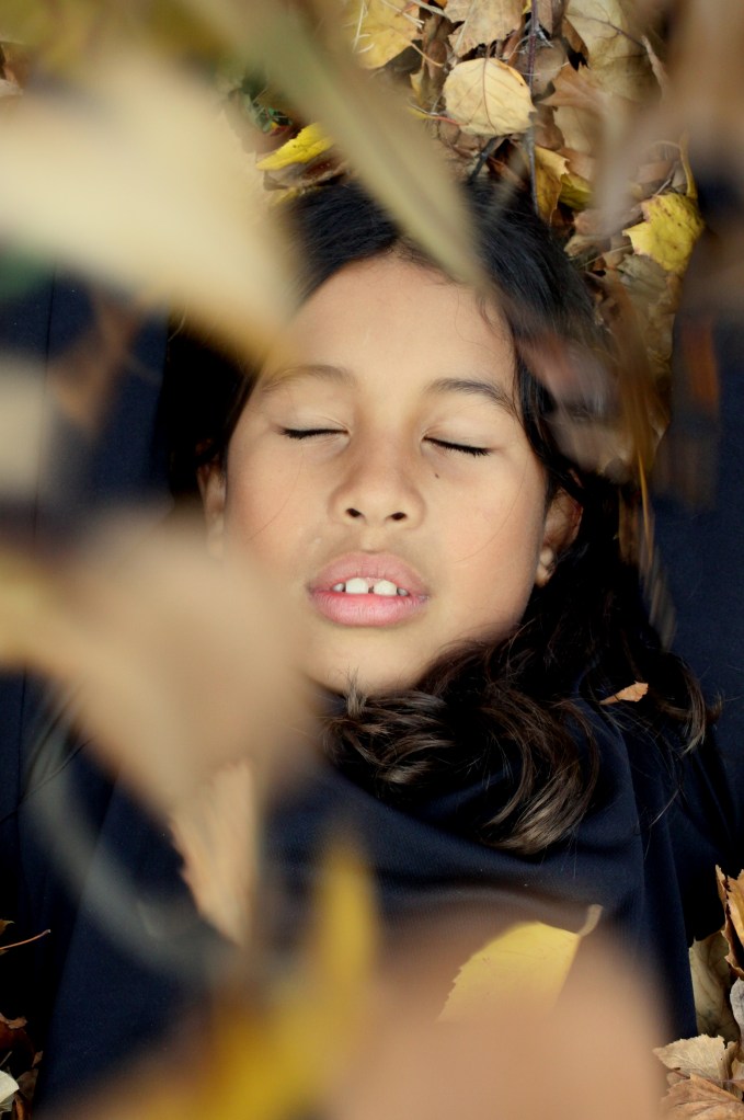 What a lucky shot. The kids and I were in the yard working hard at getting the ideal Christmas card photo. After they had had enough they started jumping into a pile of leaves in the yard. Mom kept snapping away. At one point, A. lay down in the leaves to take a break and M. started pouring leaves on her. CLICK!